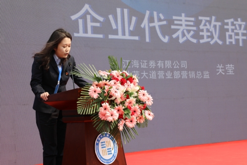 江海证券有限公司哈尔滨世茂大道营业部销售总监、我校2015级校友关莹代表企业发言