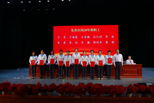 校长于长福为光荣在岗20年教职工颁发荣誉徽章