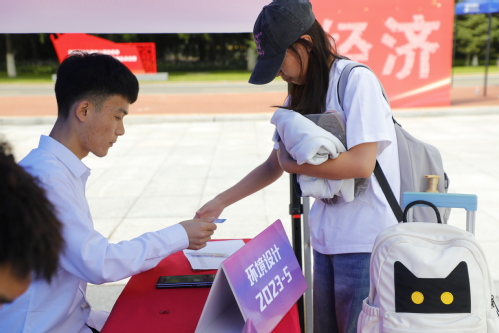报到现场的“龙财为你打开”“我爱龙财”等展板,吸引新生驻足观看、“打卡”留念。此外,学校还为新生准备了一份特别的“伴手礼”,打开印有学校标识与校训的麻质环保包,里面装着一个冰霸杯,学校还赠送“暖心第一餐”专属餐券,诚邀新生和家长到饮食中心品尝龙财味道,这是一份专属于龙财的浪漫心意。